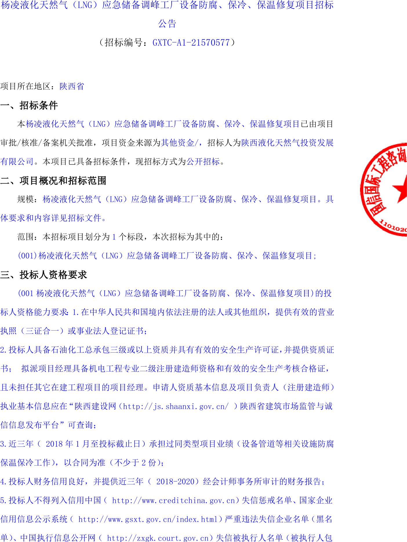 陕西省杨凌液化天然气(LNG)应急储备调峰工厂设备防腐、保冷、保温修复项目招标公告