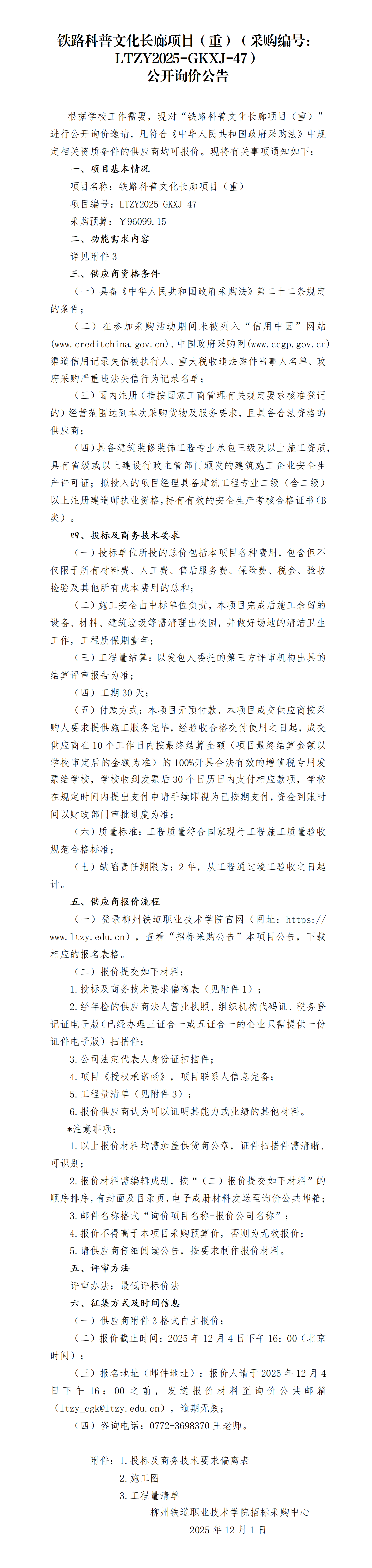 铁路科普文化长廊项目(重)(采购编号:LTZY2025-GKXJ-47)公开询价公告